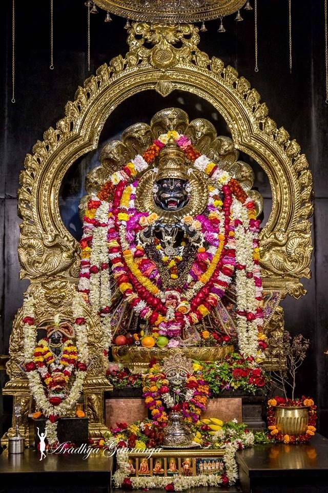 Hiranyakashipu, a demon controlling the three world, was extremely proud and he hated Lord Vishnu. But little Prahlada, his five year old son, was a great devotee of Lord Vishnu. Therefore, Hiranyakashipu tried to kill Prahlada in several ways; but failed in all his attempts because of the protection given by Lord to his dear devotee. Finally when Hiranyakashipu asked his little son where the Lord resides, Prahlada replied that the Lord resides everywhere. Mocking this response, Hiranyakashipu broke a pillar in his palace, and the Lord appeared from that pillar in his half man-half lion incarnation – Narasimha. Lord Narsimhadev is therefore worshipped by the devotees as their Supreme protector and they also pray that He vanquishes all obstacles they may face on the path of devotional service. So it is with much enthusiasm that the devotees come to together to worship the Lord on this day of His appearance in the material world.